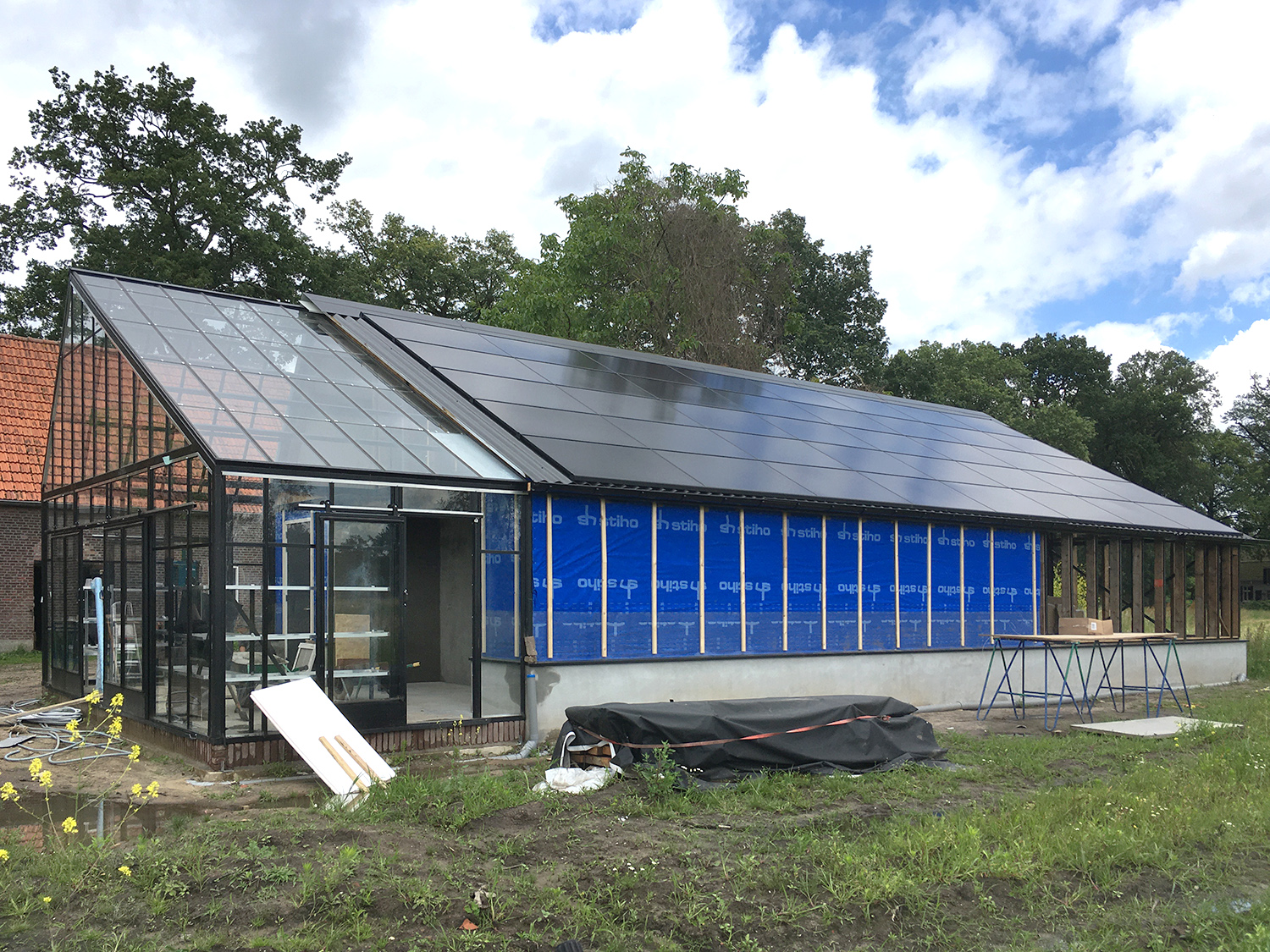 Na de zomer zal de uitgebreide renovatie en herbestemming van de rijksmonumentale hoekboerderij Middelste Hoeff in Aarle-Rixtel van start gaan. Op het achtererf van de boerderij nadert de nieuwe schuur intussen zijn voltooiing. De bijbehorende kas die geheel is opgebouwd uit hergebruikte profielen en glasplaten is een mooi staaltje circulair bouwen.
