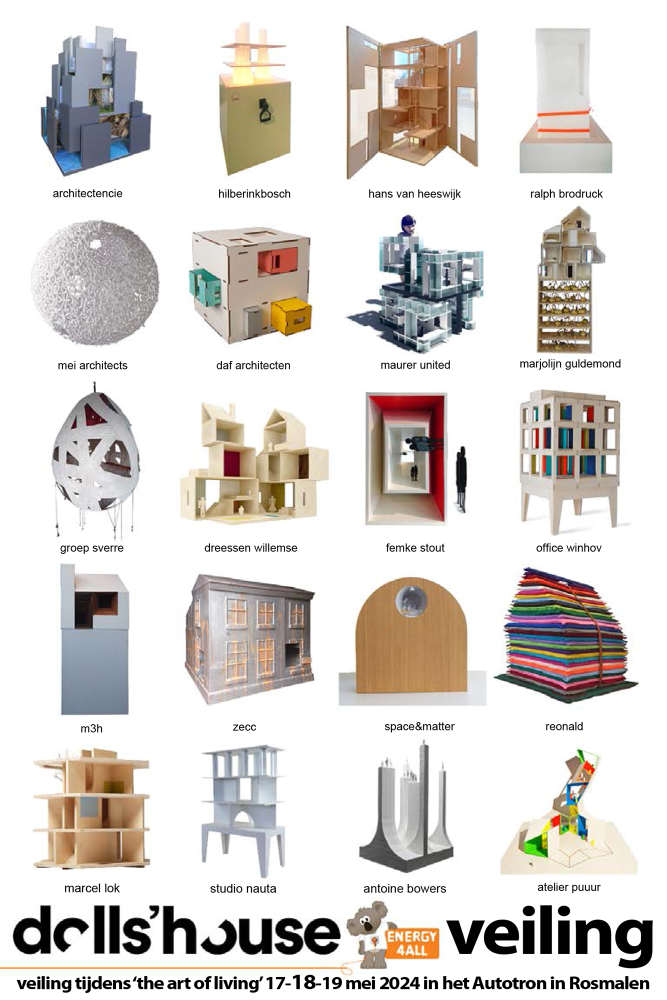 Voor het project Dolls’house hebben 20 architectenbureaus een speciaal poppenhuis ontworpen en gemaakt voor zieke kinderen. Peter Masselink bedacht het initiatief om geld en aandacht te genereren voor een medicijn tegen energiestofwisselingsziektes. Op 18 mei 2024 is het zover en worden de poppenhuizen door Jochem van Gelder geveild in het Autotron. De opbrengst komen ten goede aan de stichting Energy4all.