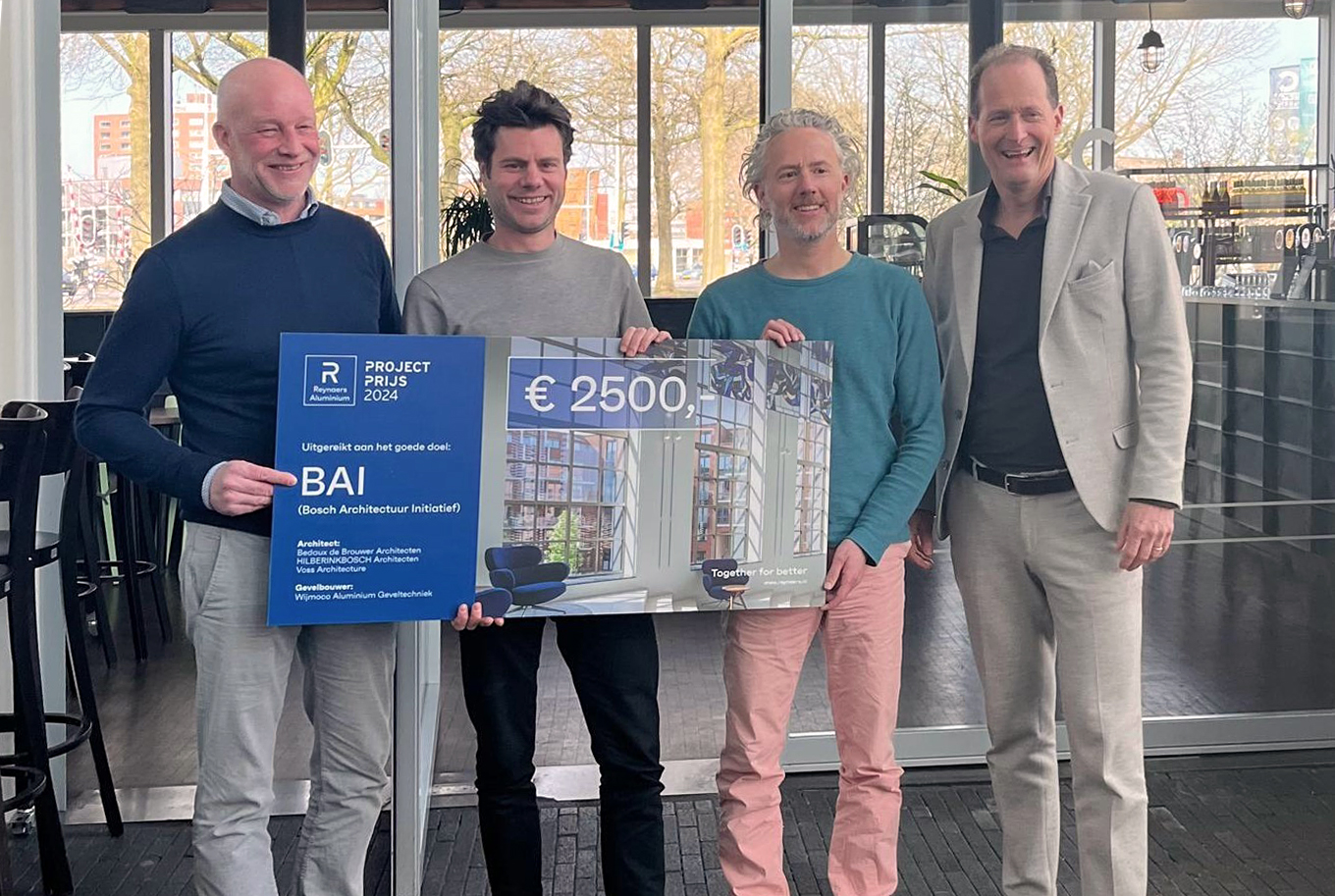 Bron site Reynaers: Elk jaar reikt Reynaers Aluminium een cheque uit aan een goed-architectuurdoel dat in overleg met de winnende architect van de Reynaers Projectprijs wordt bepaald. In 2024 wonnen Voss Architecture, HILBERINKBOSCH Architecten en Bedaux de Brouwer Architecten samen de publieksprijs met het project Amadeiro in het hart van ‘s-Hertogenbosch. Zij hebben gekozen om de cheque te overhandigen aan het Bosch Architectuur Initiatief.